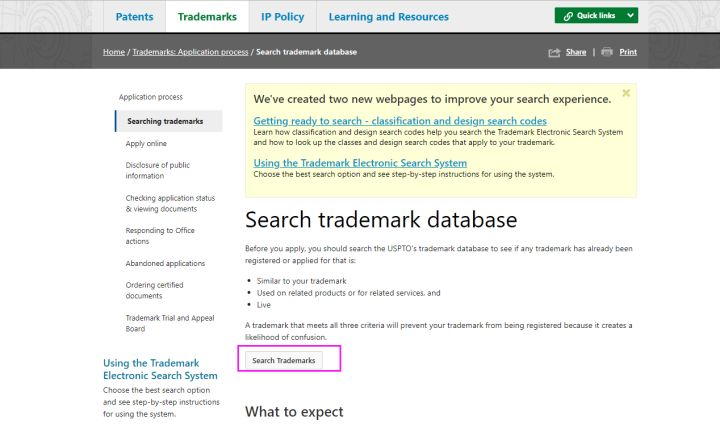 2.不用詳細(xì)閱讀,點擊“searching trademarks",選擇第一種查詢方式;