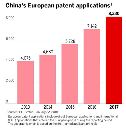 歐洲專利局稱,2017年,歐洲專利局共收到16.6萬份國(guó)際專利申請(qǐng),比2016年增長(zhǎng)3.9%;中國(guó)遞交的專利申請(qǐng)數(shù)量高達(dá)8330項(xiàng),比前一年增長(zhǎng)16.6%,中國(guó)首次取代瑞士成為歐洲專利局前五大申請(qǐng)國(guó)家之一,僅次于美國(guó)、德國(guó)、日本和法國(guó)。