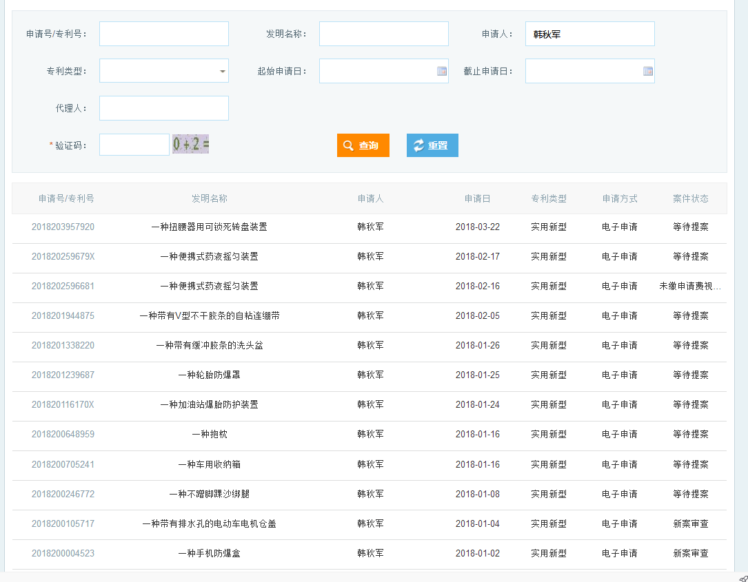 第四步,點(diǎn)擊“查詢”后,所有該申請(qǐng)人申請(qǐng)的已進(jìn)入公示期的發(fā)明專利、已取得授權(quán)的實(shí)用新型專利和外觀設(shè)計(jì)專利,都會(huì)列示出來(lái)。