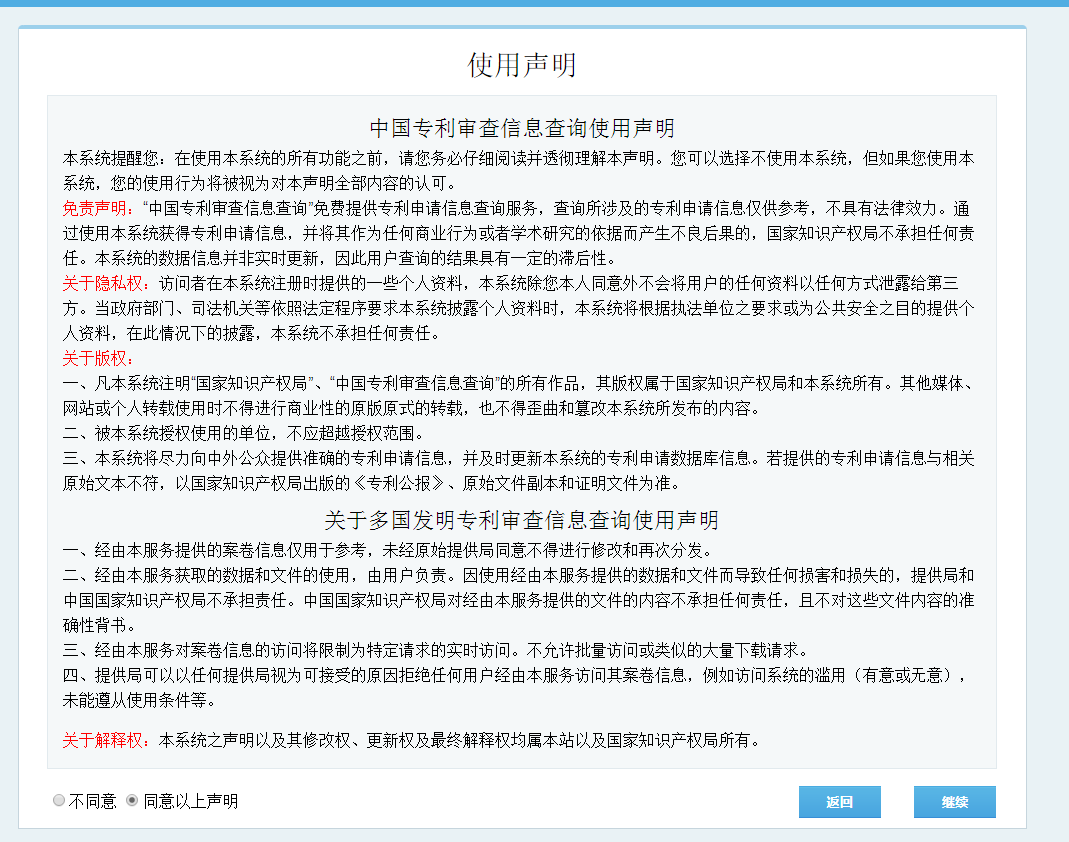 第二步,點(diǎn)擊“公眾查詢”下的“點(diǎn)擊進(jìn)入”,出現(xiàn)如下界面。點(diǎn)擊“同意以上聲明”后,點(diǎn)擊“繼續(xù)”。
