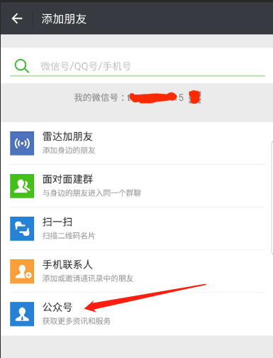 點右上角加號.點擊添加朋友,選擇 公眾號,如下圖所示: