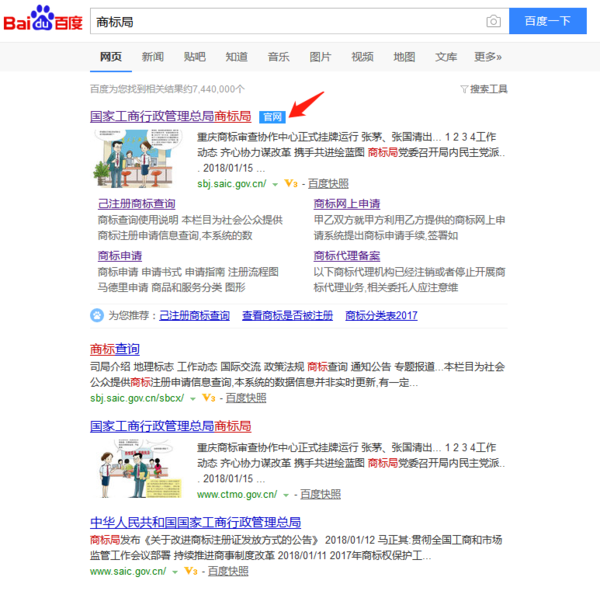 第一種:百度搜“商標(biāo)局”然后找到帶有官網(wǎng)標(biāo)簽的網(wǎng)址,不帶官網(wǎng)標(biāo)簽的基本都是廣告,不要進