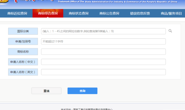 第二項是綜合查詢,可以根據(jù)商標(biāo)的申請人、名稱、注冊號等來查詢,其中綜合查詢普通用戶用的最多,因為可以查到自己商標(biāo)的狀態(tài),別人公司的商標(biāo)等,可查范圍多,點擊綜合查詢后如下圖所示