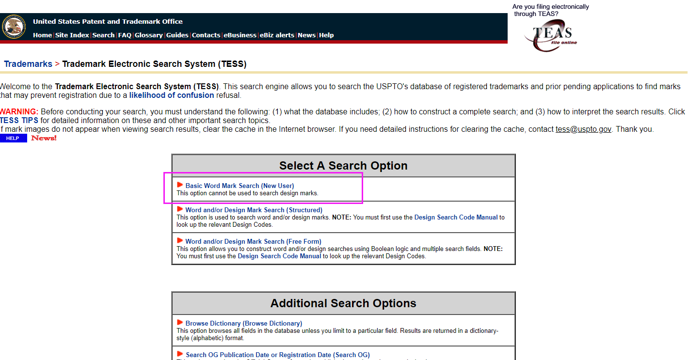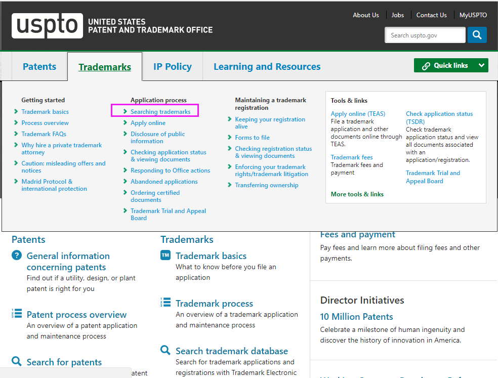2.不用詳細閱讀,點擊“searching trademarks",選擇第一種查詢方式;