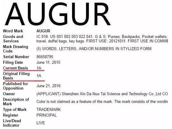 美國商標(biāo)自注冊(cè)有一個(gè)非常重要的概念:Filling Basis。任意在uspto(美國商標(biāo)局)網(wǎng)站搜索一個(gè)商標(biāo)如Augur,會(huì)看到如下信息。