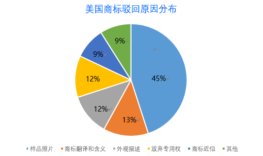 在美國申請的商標,被駁回原因大多是:產(chǎn)品或服務的使用證據(jù)(樣品照片)、商標翻譯和含義、外觀描述、商標近似等。以下為常見的駁回原因分析圖,供題主參考。