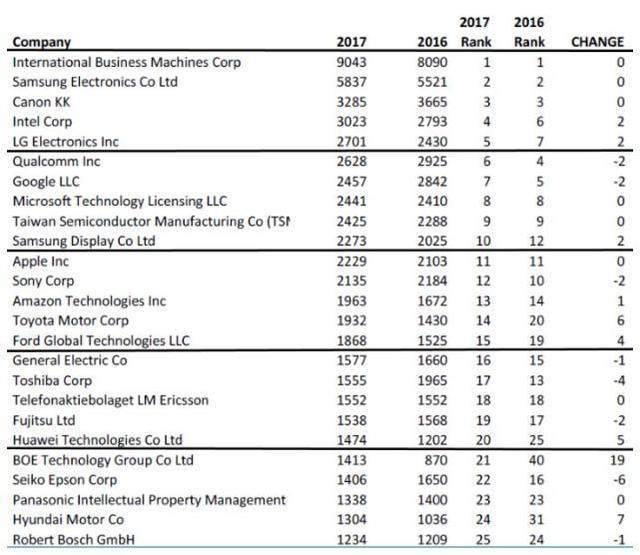 2017年,美國(guó)專利申請(qǐng)數(shù)量,前十名沒有中國(guó)企業(yè)。