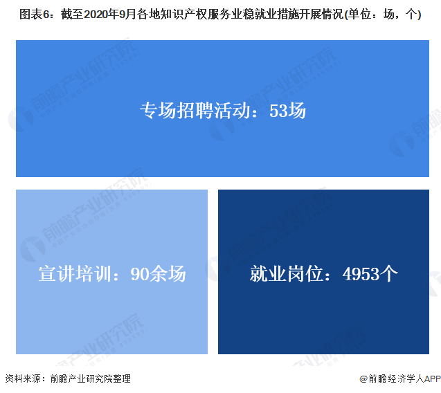 2020年4月份,國家知識產(chǎn)權(quán)局印發(fā)《關(guān)于支持和引導(dǎo)知識產(chǎn)權(quán)服務(wù)業(yè)積極應(yīng)對疫情影響穩(wěn)定和擴(kuò)大就業(yè)的通知》,組織各地知識產(chǎn)權(quán)管理部門支持引導(dǎo)知識產(chǎn)權(quán)服務(wù)業(yè)穩(wěn)定和擴(kuò)大就業(yè),已取得階段性成果。據(jù)初步統(tǒng)計(jì),截至2020年9月15日,各地共組織開展知識產(chǎn)權(quán)服務(wù)業(yè)專場招聘活動53場,組織各類知識產(chǎn)權(quán)服務(wù)業(yè)宣講培訓(xùn)90余場,多家知識產(chǎn)權(quán)服務(wù)機(jī)構(gòu)參與,提供知識產(chǎn)權(quán)服務(wù)類就業(yè)崗位4953個(gè)。