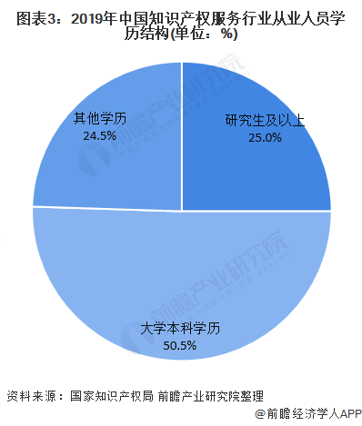 調(diào)查顯示,截至2019年底,參與調(diào)查的知識產(chǎn)權(quán)服務(wù)機(jī)構(gòu)的從業(yè)人員中,擁有研究生以上學(xué)歷從業(yè)人員人數(shù)占25.0%,大學(xué)本科學(xué)歷占50.5%。總計(jì)大學(xué)以上學(xué)歷比例為75.5%。
