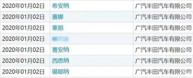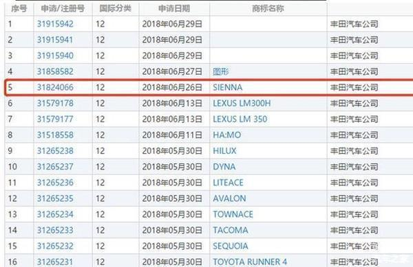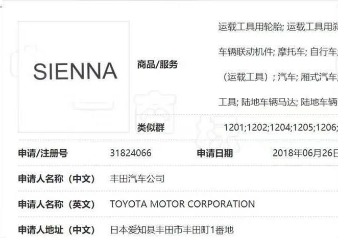 從表格當中我們可以看到廣汽豐田注冊的這些名稱有希安納、賽娜、塞那、賽安納、錫耶納、西恩納這些和Sienna音譯較為接近的中文名稱,注冊這么些個名稱也是為了對“Sienna”的中文名進行保護的意思,也證明了一點這款車定將會落戶廣汽豐田進行國產(chǎn)。