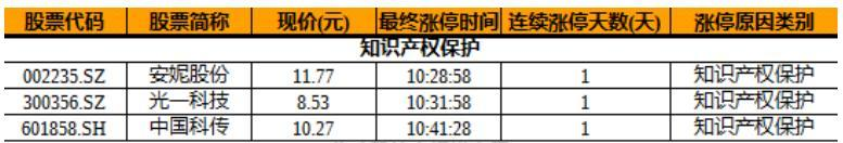 而今日,知識(shí)產(chǎn)權(quán)概念股也表現(xiàn)搶眼。盤(pán)面上,安妮股份(002235)直線封板,光一科技(300356)、中國(guó)科傳(601858)隨后漲停。