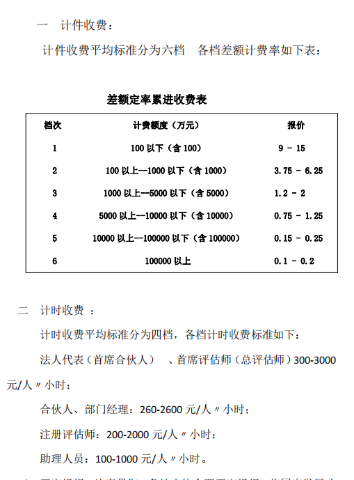 資產(chǎn)評(píng)估的收費(fèi)標(biāo)準(zhǔn)一直沒有更新,行業(yè)里普遍選擇2009年的標(biāo)準(zhǔn),統(tǒng)稱09版標(biāo)準(zhǔn);即,國(guó)家發(fā)展改革委、財(cái)政部關(guān)于發(fā)布《資產(chǎn)評(píng)估收費(fèi)管理辦法》的通知(發(fā)改價(jià)格【2009】2914號(hào))文件之規(guī)定,以委托方委估資產(chǎn)的價(jià)值總額為計(jì)費(fèi)基數(shù),當(dāng)然也有少數(shù)案子是選擇計(jì)時(shí)的方式。