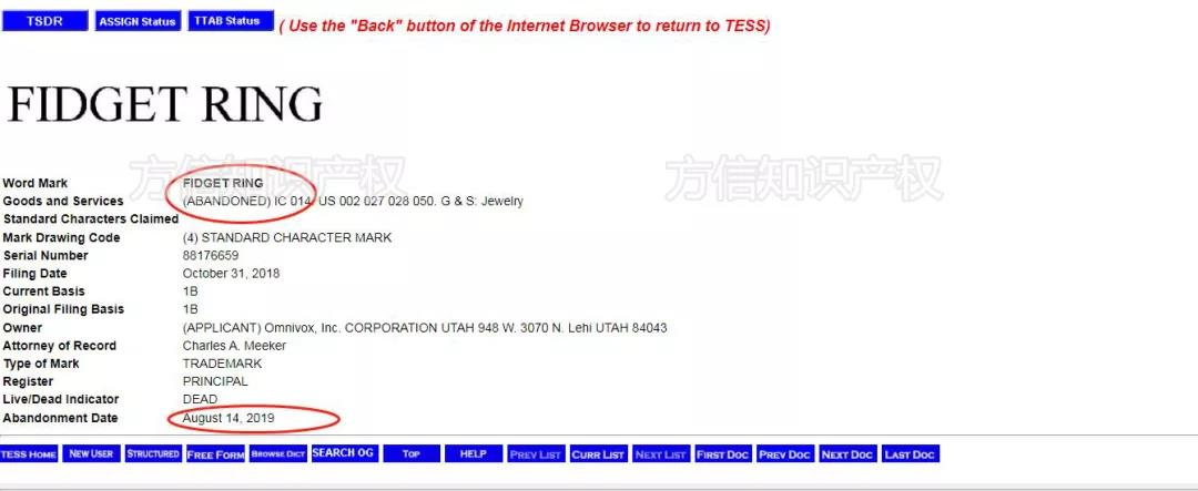 但小信還是發(fā)現(xiàn)早在 2019 年甚至更早的 1999 年里都有人申請了 “ fidget rings ” 14 類商標,但最終因為描述性駁回。
