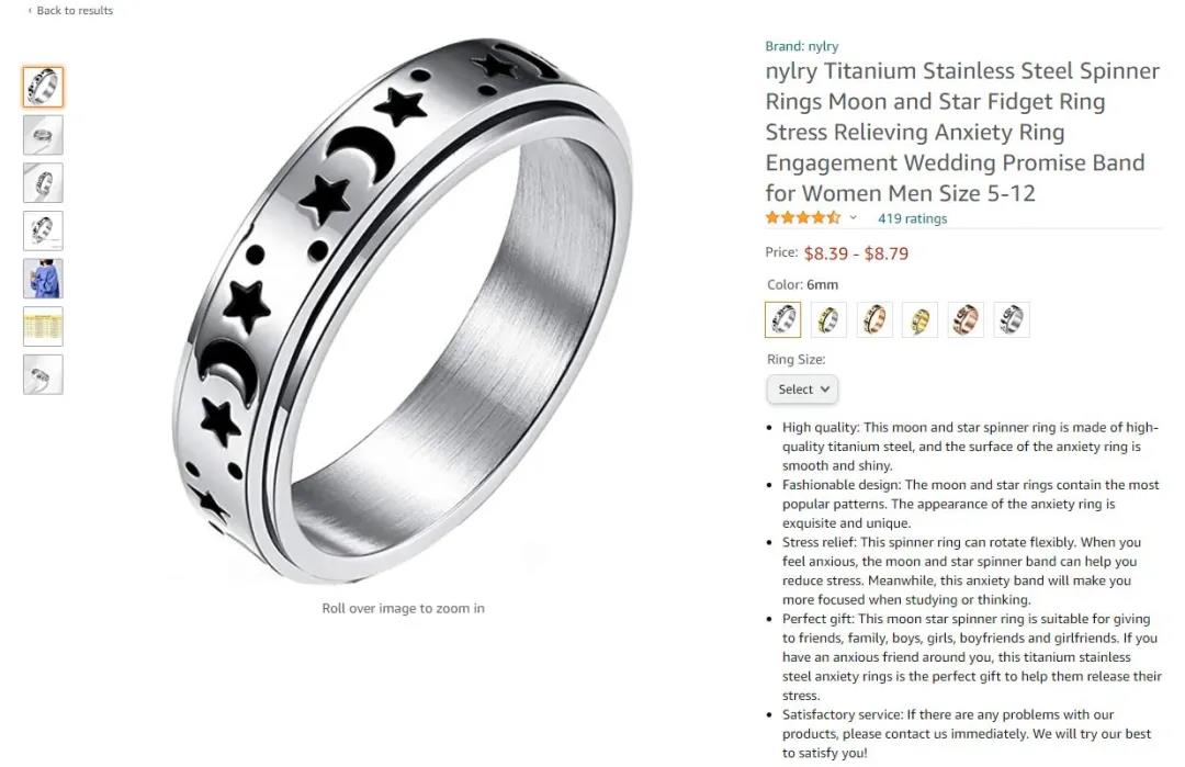 圖中亞馬遜產(chǎn)品 3 中的解壓戒指,小信覺得最大的特色就是星星和月亮的造型,無論是簡單大氣的造型還是浪漫的搭配,都一定會深受女性買家喜歡。